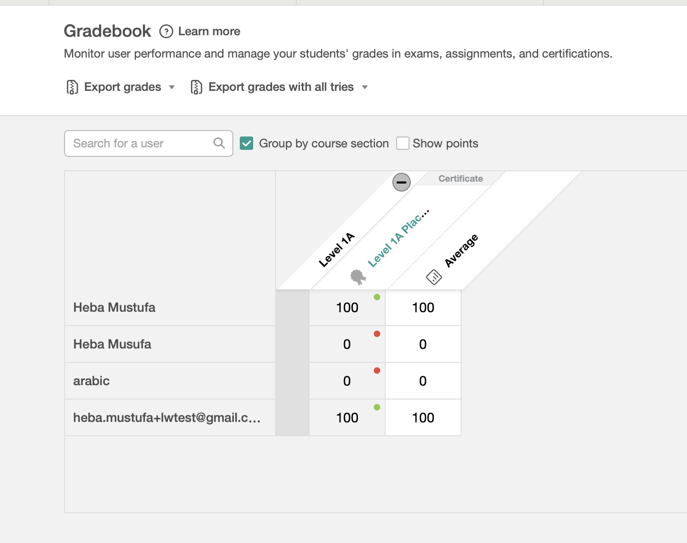 There is an option to group by course section in grade book. Can have one grade book for all? Is there a way to use grade book for any data collection or actions?