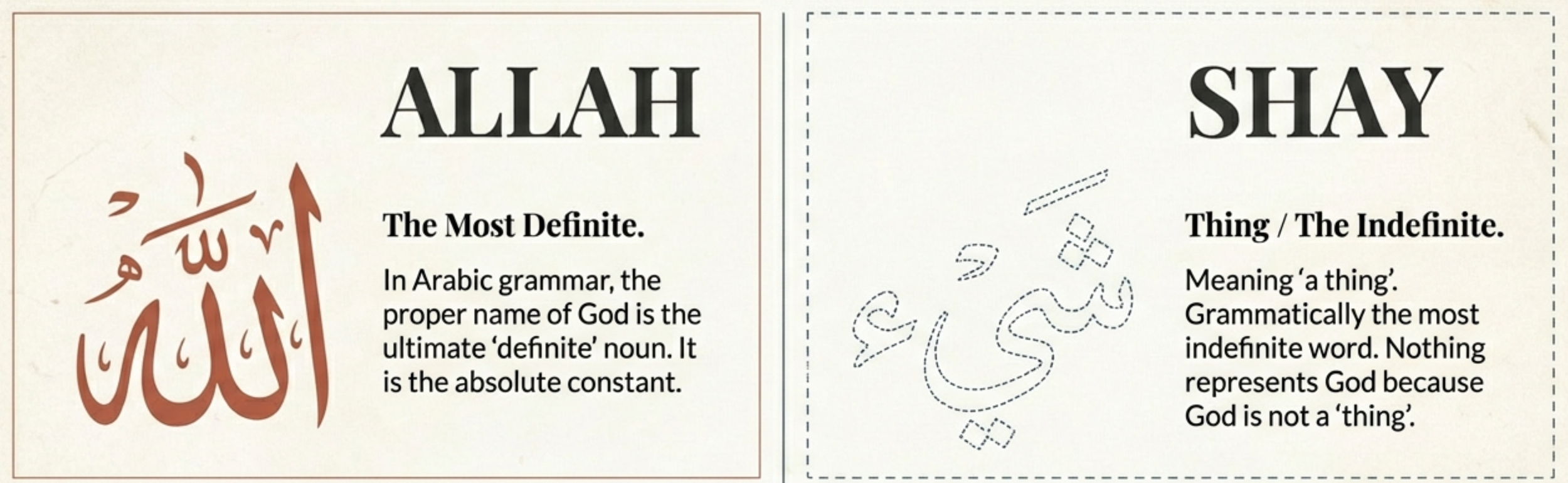 1. Allah الله: is the most definite word in Arabic. The word شَيء ("thing") is the most indefinite. ‘There is nothing (Shay) like God" (لَيسَ كَمِثْلِهِ شَيء)